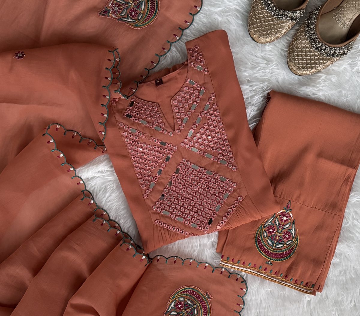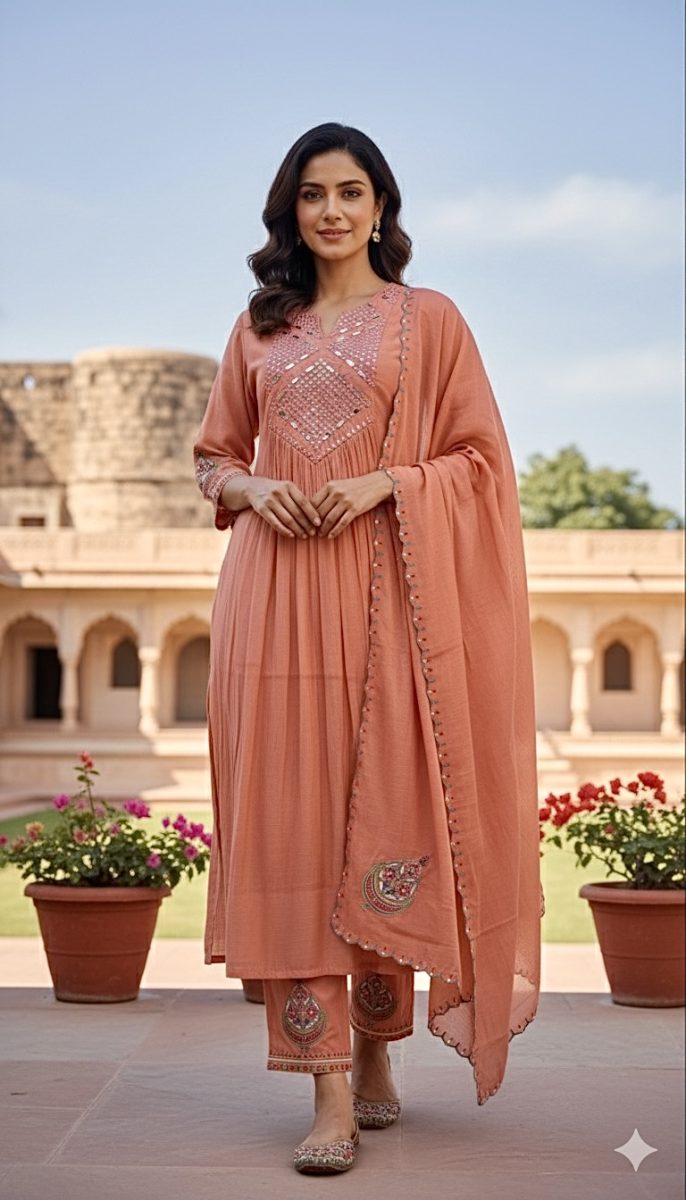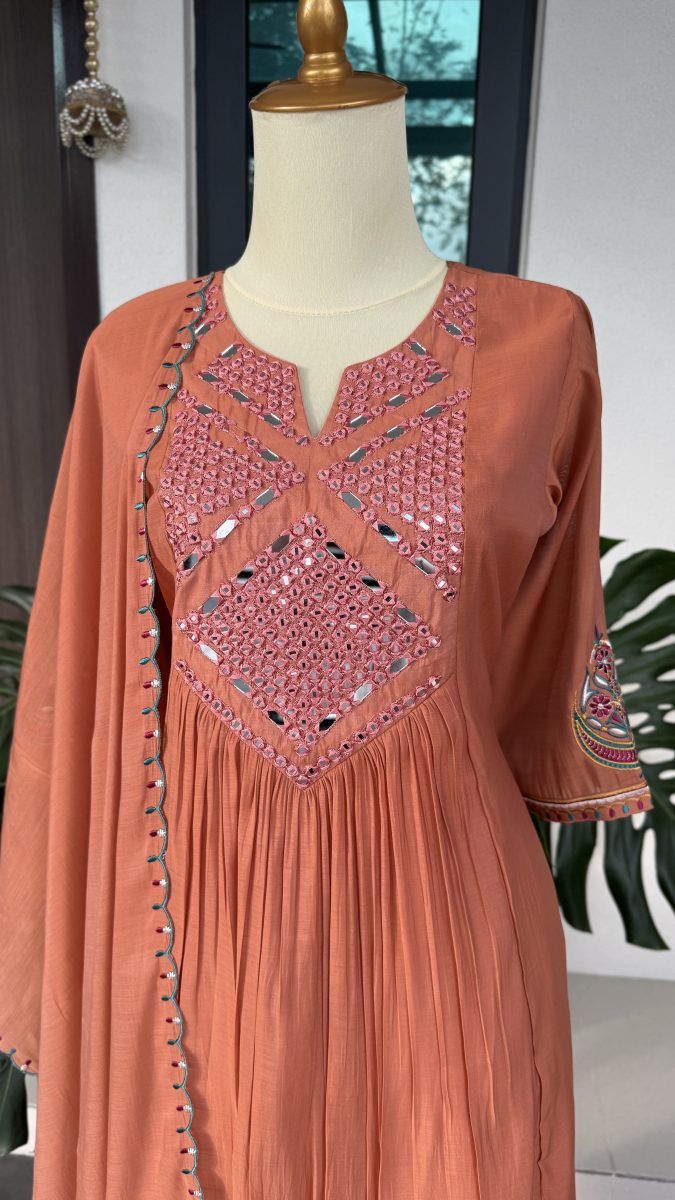 Pastel Orange Pure MulChanderi Mirror Work Suit